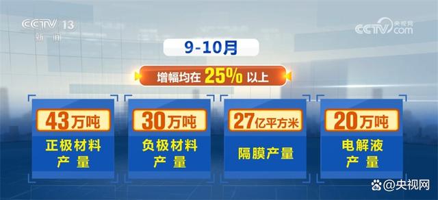 據(jù)了解,今年以來,我國(guó)鋰電池生產(chǎn)各環(huán)節(jié)均保持高位增長(zhǎng)。9—10月,正極材料、負(fù)極材料、隔膜、電解液產(chǎn)量分別達(dá)到43萬噸、30萬噸、27億平方米、20萬噸,增幅均在25%以上。
