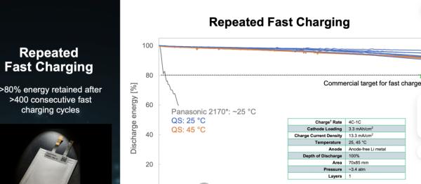 與此同時(shí),測(cè)試數(shù)據(jù)還顯示,配備 QuantumScape電池的電動(dòng)汽車,WLTP 續(xù)航里程為 500-600公里(311—373 英里),在電池的全生命周期內(nèi),可以行駛超過50萬公里(約311,000 英里),不會(huì)有任何續(xù)航能力衰退。