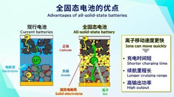 在鋰離子電池中,鋰離子經(jīng)由液體電解質(zhì)從負(fù)極移動(dòng)到正極,由此產(chǎn)生電流。全固態(tài)電池原理與之相同。理論上,固態(tài)電池的能量密度是鐵鋰電池的2倍,且固態(tài)電池還擁有耐高溫、抗穿刺的超高安全性,以及寬溫域工作窗口等眾多優(yōu)點(diǎn)。