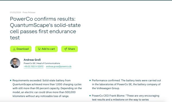 而1月3日,大眾集團(tuán)的電池子公司 PowerCo也發(fā)布了對(duì)QuantumScape 這批24 層固態(tài)電池A樣品的耐久性測(cè)試的結(jié)果報(bào)告,確認(rèn)了QuantumScape的聲明。