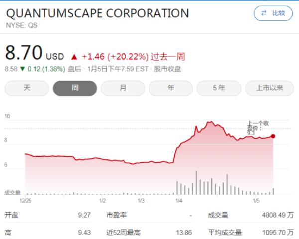 此次其固態(tài)電池通過大眾集團(tuán)方面耐久性測(cè)試的消息公布后第二日,QuantumScape股上漲 43%,收于 9.30 美元,創(chuàng)下 8 月以來的最高收盤價(jià)。盤中上漲約54%。該股在過去52周內(nèi)上漲了 72%,但較 2020 年 12 月創(chuàng)下的歷史高點(diǎn)下跌 93%。