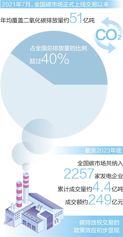 2021年7月全國碳市場正式上線交易以來,運行整體平穩(wěn),年均覆蓋二氧化碳排放量約51億噸,占全國總排放量的比例超過40%。截至2023年底,全國碳市場共納入2257家發(fā)電企業(yè),累計成交量約4.4億噸,成交額約249億元,碳排放權交易的政策效應初步顯現(xiàn)。