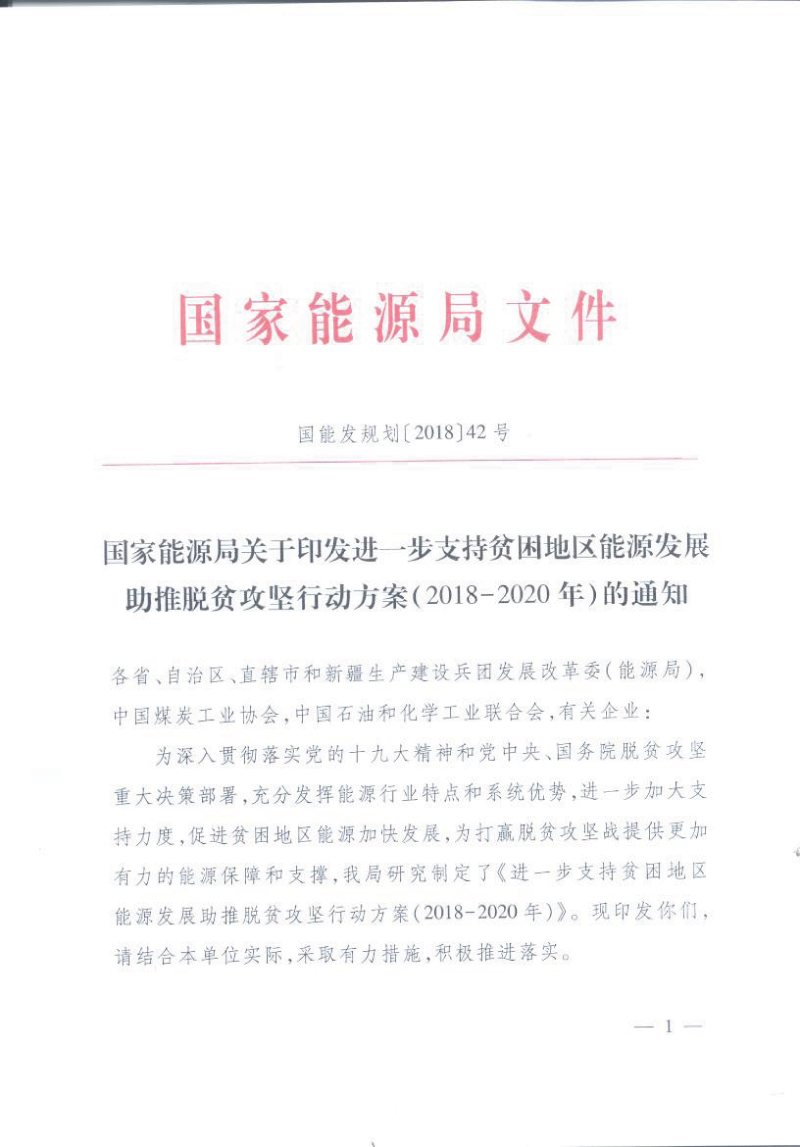 國(guó)家能源局關(guān)于印發(fā)進(jìn)一步支持貧困地區(qū)能源發(fā)展助推脫貧攻堅(jiān)行動(dòng)方案(2018-2020年)的通知