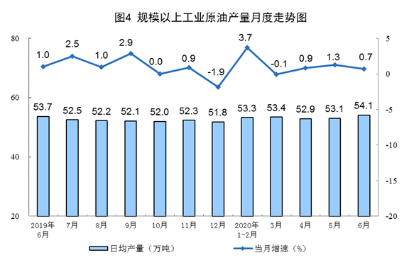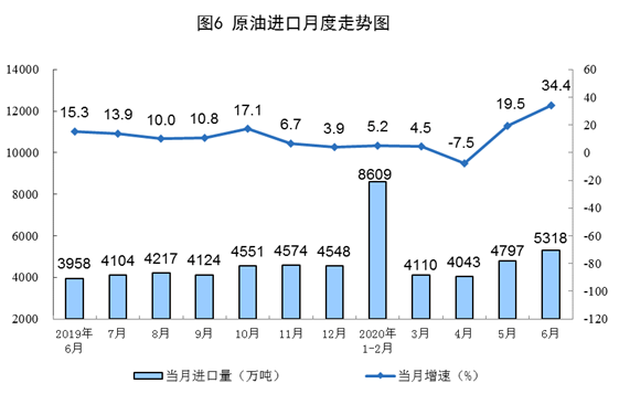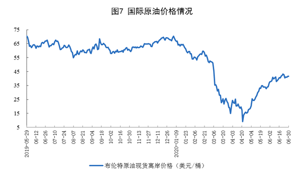 原油進(jìn)口快速增長,國際原油價格大幅回升。6月份,進(jìn)口原油5318萬噸,同比增長34.4%。上半年,進(jìn)口原油2.69億噸,同比增長9.9%,比一季度加快4.9個百分點。6月30日布倫特原油現(xiàn)貨離岸價格為41.64美元/桶,比5月29日的34.15美元/桶回升21.9%。