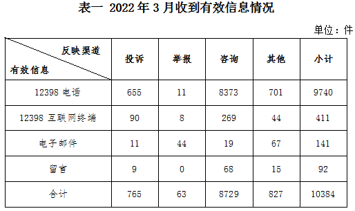 2022年3月,國家能源局12398能源監(jiān)管熱線(以下簡稱12398熱線)共收到有效信息10384件(包含投訴、舉報、咨詢和其他訴求類別),環(huán)比增加24.12%,同比增加23.14%。(2022年3月收到有效信息情況見表一)
