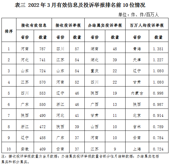 各省(自治區(qū)、直轄市)按照接收的有效信息數(shù)量排序,河南、河北、山東、江蘇、四川、廣東、陜西、浙江、遼寧、安徽排在全國前10位;按照接收的投訴舉報數(shù)量排序,四川、江蘇、山東、河南、遼寧、浙江、河北、陜西、廣東、云南排在全國前10位;按照辦結(jié)屬實的投訴舉報數(shù)量排序,湖南、湖北、重慶、四川、陜西、廣西、甘肅、山西、河南、江蘇排在全國前10位;按照百萬人均投訴舉報數(shù)量排序,青海、天津、遼寧、甘肅、內(nèi)蒙古、陜西、北京、吉林、云南、上海排在全國前10位。(2022年3月有效信息及投訴舉報排名前10位情況見表三)