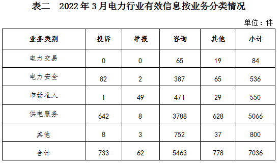 電力行業(yè)排在首位,有效信息數(shù)量為7036件,占全部有效信息的67.76%。群眾關(guān)注的內(nèi)容主要集中在供電服務(wù)、故障停電、供電安全等方面。(2022年3月電力行業(yè)有效信息按業(yè)務(wù)分類情況見表二)