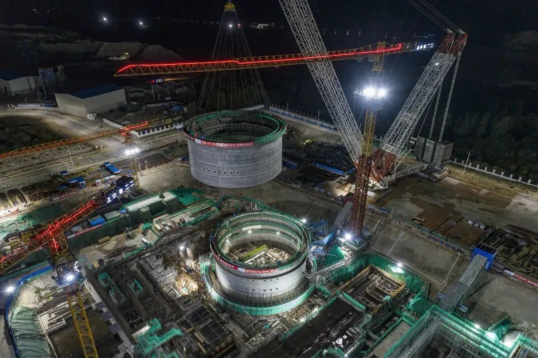 本次吊裝的鋼制安全殼上部筒體整體高度約15米,吊裝重量約720噸,是玲龍一號工程單次重量最大的一次吊裝。鋼制安全殼上部筒體整體由4層共32個瓣片拼裝而成,現(xiàn)場采用了工廠化制造、模塊化施工的先進建設模式,優(yōu)化了現(xiàn)場施工邏輯,有效節(jié)約了現(xiàn)場施工工期,為反應堆土建結構與鋼結構協(xié)同推進創(chuàng)造了條件。