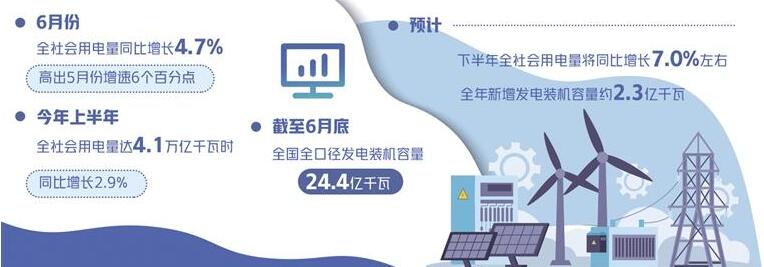 “隨著疫情逐步緩解,穩(wěn)經(jīng)濟(jì)政策效果加快顯現(xiàn),疊加多地高溫天氣因素,6月份全社會用電量同比增長4.7%,高出5月份增速6個(gè)百分點(diǎn)。”在近日召開的全國電力供需形勢半年報(bào)發(fā)布會上,中國電力企業(yè)聯(lián)合會秘書長郝英杰表示,6月份電力消費(fèi)增速明顯回升,一定程度上反映出當(dāng)前復(fù)工復(fù)產(chǎn)、復(fù)商復(fù)市取得積極成效。