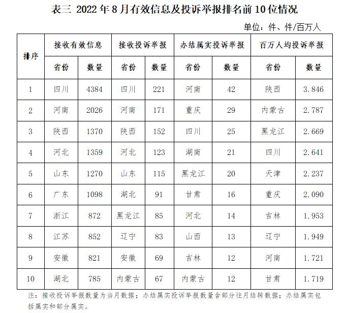 各省(自治區(qū)、直轄市)按照接收的有效信息數(shù)量排序,四川、河南、陜西、河北、山東、廣東、浙江、江蘇、安徽、湖北排在全國前10位;按照接收的投訴舉報(bào)數(shù)量排序,四川、河南、陜西、河北、山東、湖北、黑龍江、遼寧、安徽、內(nèi)蒙古排在全國前10位;按照辦結(jié)屬實(shí)的投訴舉報(bào)數(shù)量排序,河南、重慶、四川、湖南、黑龍江、甘肅、河北、山西、吉林、內(nèi)蒙古排在全國前10位;按照百萬人均投訴舉報(bào)數(shù)量排序,陜西、內(nèi)蒙古、黑龍江、四川、天津、重慶、吉林、遼寧、河南、甘肅排在全國前10位。(2022年8月有效信息及投訴舉報(bào)排名前10位情況見表三)