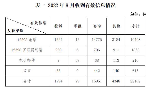2022年8月,國家能源局12398能源監(jiān)管熱線(以下簡稱12398熱線)共收到有效信息22182件(包含投訴、舉報(bào)、咨詢和其他訴求類別),環(huán)比增加18.10%,同比增加77.67%。(2022年8月收到有效信息情況見表一)