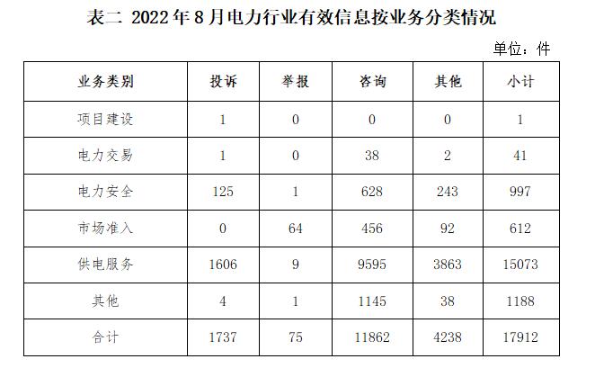 電力行業(yè)排在首位,有效信息數(shù)量為17912件,占全部有效信息的80.75%。群眾關(guān)注的內(nèi)容主要集中在供電服務(wù)、電力安全、市場準(zhǔn)入等方面。(2022年8月電力行業(yè)有效信息按業(yè)務(wù)分類情況見表二)