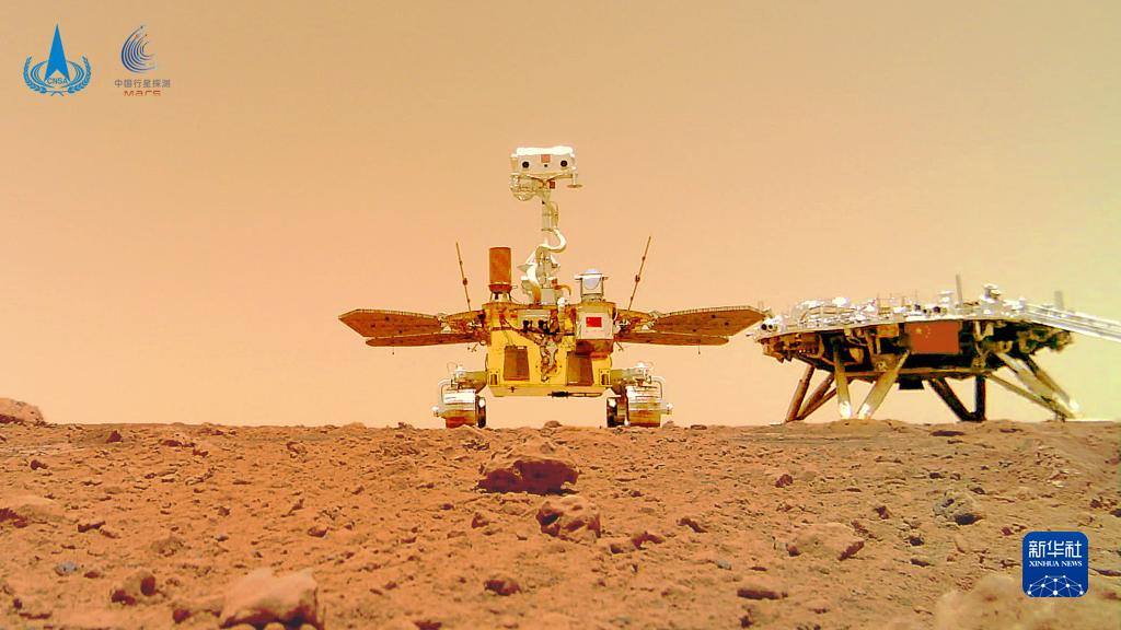 由祝融號(hào)火星車拍攝的著陸點(diǎn)全景、火星地形地貌、“中國印跡”和“著巡合影”等影像圖。