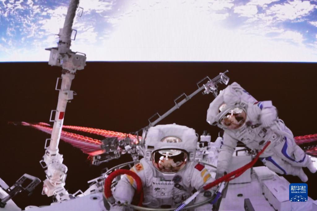 2022年9月2日在北京航天飛行控制中心拍攝的神舟十四號(hào)航天員劉洋(左)結(jié)束出艙任務(wù)正在返回的畫面。 新華社發(fā)(李杰攝)