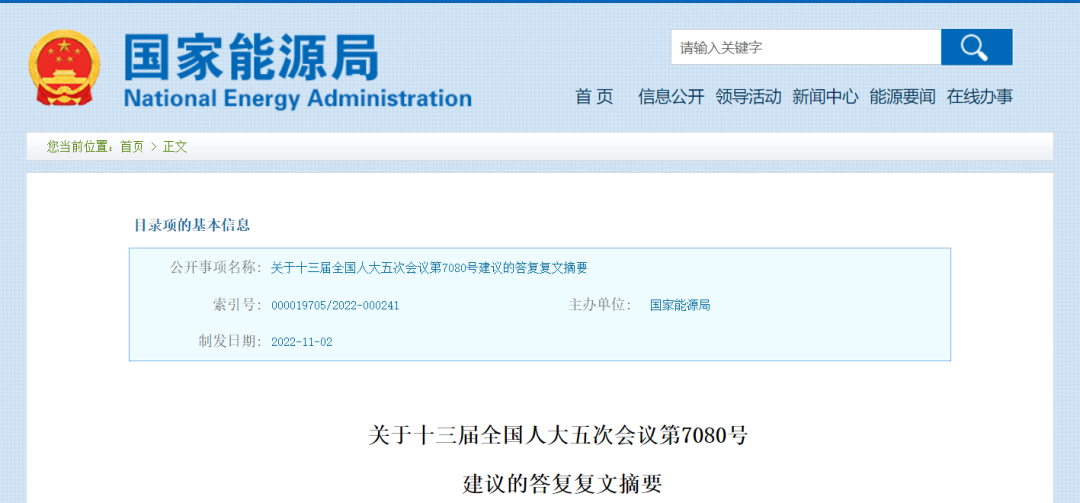 11月2日,國(guó)家能源局發(fā)布《關(guān)于十三屆全國(guó)人大五次會(huì)議第7080號(hào)建議的答復(fù)復(fù)文摘要》。