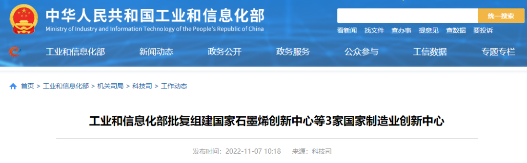 11月7日,工信部批復(fù)組建國(guó)家石墨烯創(chuàng)新中心等3家國(guó)家制造業(yè)創(chuàng)新中心。