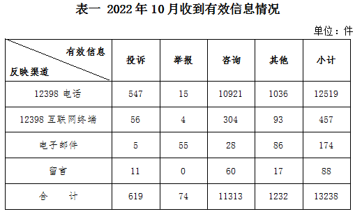 2022年10月,國家能源局12398能源監(jiān)管熱線(以下簡稱12398熱線)共收到有效信息13238件(包含投訴、舉報、咨詢和其他訴求類別),環(huán)比減少6.23%,同比增加24.69%。(2022年10月收到有效信息情況見表一)