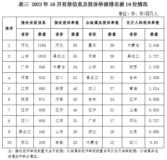 各省(自治區(qū)、直轄市)按照接收的有效信息數(shù)量排序,河北、山東、廣東、河南、江蘇、陜西、遼寧、四川、黑龍江、浙江排在全國前10位;按照接收的投訴舉報數(shù)量排序,河北、黑龍江、內蒙古、四川、陜西、河南、遼寧、江蘇、山東、安徽排在全國前10位;按照辦結屬實的投訴舉報數(shù)量排序,重慶、河南、山東、黑龍江、四川、吉林、遼寧、廣東、浙江、內蒙古排在全國前10位;按照百萬人均投訴舉報數(shù)量排序,內蒙古、黑龍江、陜西、吉林、青海、遼寧、上海、河北、北京、四川排在全國前10位。(2022年10月有效信息及投訴舉報排名前10位情況見表三)