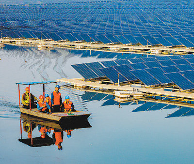 安徽淮北,電力工人在駕船巡檢“漁光互補(bǔ)”光伏發(fā)電站的設(shè)備。