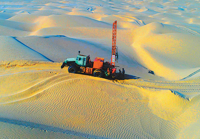 中石化地球物理公司物探隊(duì)伍在新疆塔克拉瑪干大漠深處進(jìn)行油氣勘探,助力我國(guó)油氣供應(yīng)保障能力穩(wěn)步提升。