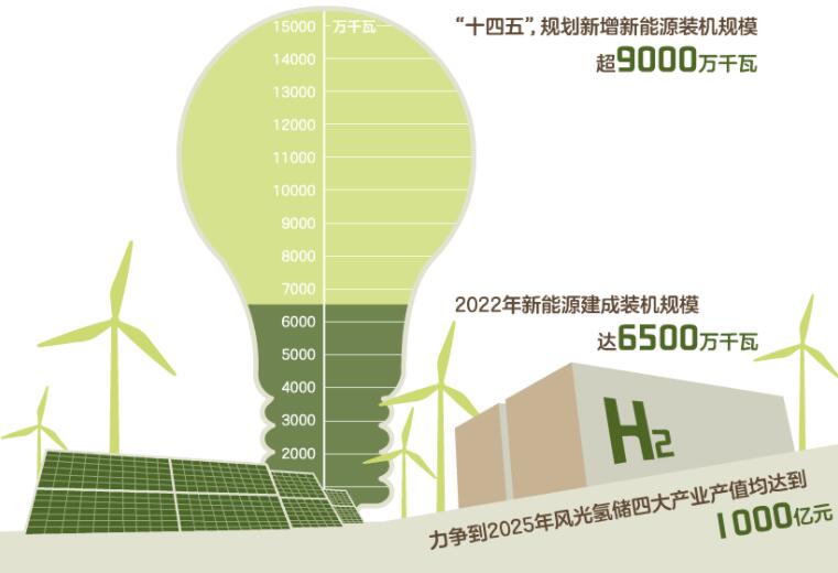 2022年,內(nèi)蒙古新能源建成裝機規(guī)模達(dá)到6500萬千瓦,連續(xù)兩年成為全國唯一一個風(fēng)電光伏發(fā)電量超過1000億千瓦時的省區(qū)。“十四五”期間,內(nèi)蒙古規(guī)劃新增超過9000萬千瓦的新能源裝機規(guī)模,力爭到2025年風(fēng)光氫儲四大產(chǎn)業(yè)產(chǎn)值均達(dá)到1000億元。