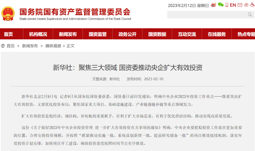 日前,國務院國資委印發(fā)《關于做好2023年中央企業(yè)投資管理 進一步擴大有效投資有關事項的通知》(以下簡稱《通知》),明確中央企業(yè)2023年投資工作三大重點領域:國家重大項目、基礎設施建設、產(chǎn)業(yè)鏈強鏈補鏈。