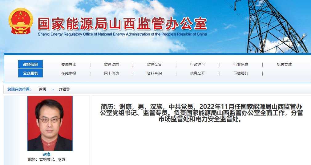 國(guó)家能源局山西監(jiān)管辦公室官網(wǎng)顯示,謝康已任國(guó)家能源局山西監(jiān)管辦公室黨組書記、監(jiān)管專員。