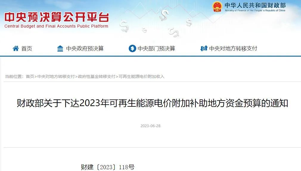 6月28日,財政部發(fā)布《關于下達2023年可再生能源電價附加補助地方資金預算的通知》(簡稱《通知》)。