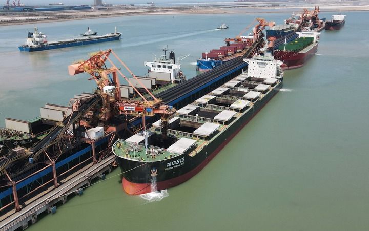 6月27日,船舶在黃驊港煤炭港區(qū)裝運(yùn)電煤(無(wú)人機(jī)照片)。