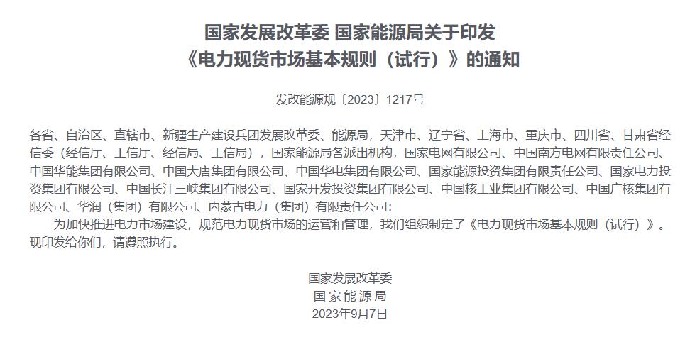 據(jù)國家發(fā)改委網(wǎng)站9月18日消息,國家發(fā)改委、國家能源局發(fā)布關(guān)于印發(fā)《電力現(xiàn)貨市場基本規(guī)則(試行)》的通知。