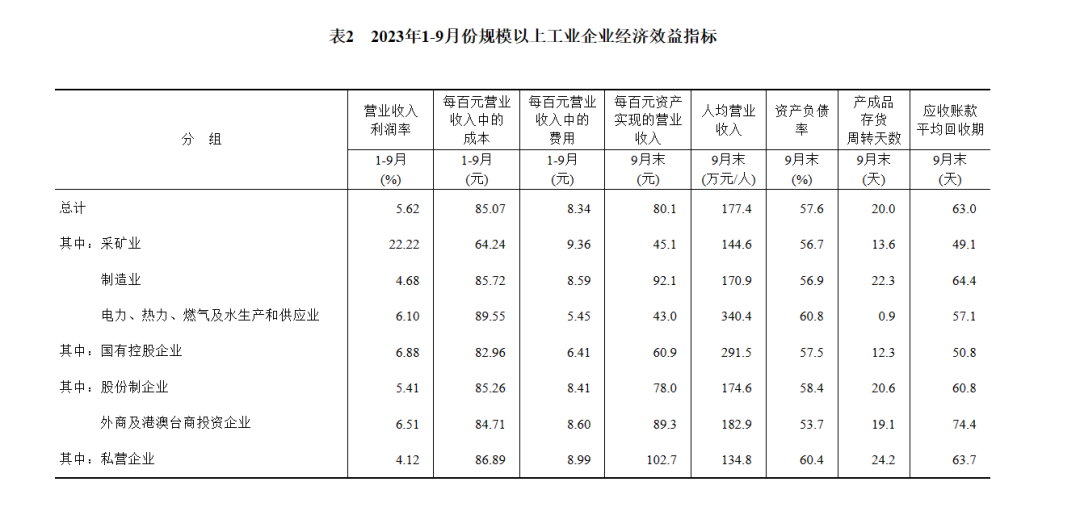 9月末,規(guī)模以上工業(yè)企業(yè)每百元資產(chǎn)實現(xiàn)的營業(yè)收入為80.1元,同比減少5.8元;人均營業(yè)收入為177.4萬元,同比增加6.0萬元;產(chǎn)成品存貨周轉天數(shù)為20.0天,同比增加1.2天;應收賬款平均回收期為63.0天,同比增加5.9天。