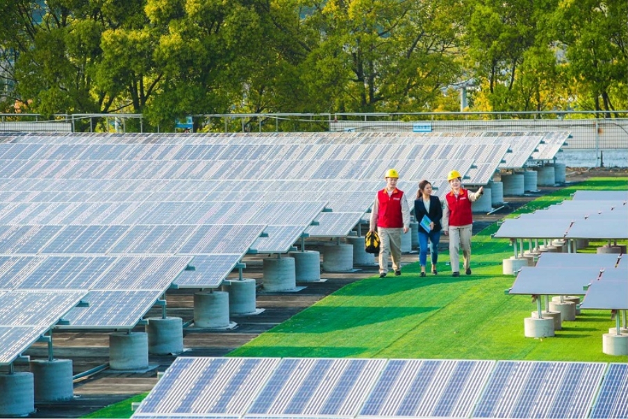 國網(wǎng)上海電力員工在光伏項目現(xiàn)場為客戶講解維護事宜。