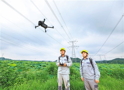 6月20日,在安徽池州,國(guó)網(wǎng)安徽電力運(yùn)維人員運(yùn)用無(wú)人機(jī)巡視特高壓重要輸電通道。