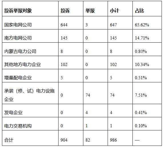從被投訴舉報對象看,供電企業(yè)907件、占投訴舉報總數(shù)的91.99%,其中國家電網(wǎng)公司647件、占比65.62%,南方電網(wǎng)公司145件、占比14.71%,內(nèi)蒙古電力公司8件、占比0.8%,其他地方電力企業(yè)102件、占比10.34%,增量配電企業(yè)5件、占比0.51%;承裝(修、試)電力設(shè)施企業(yè)74件、占比7.51%;發(fā)電企業(yè)4件、占比0.41%;電力交易機構(gòu)1件、占比0.1%。