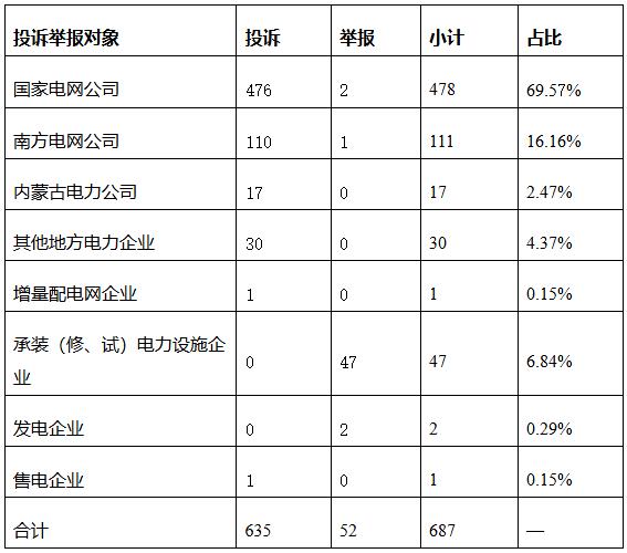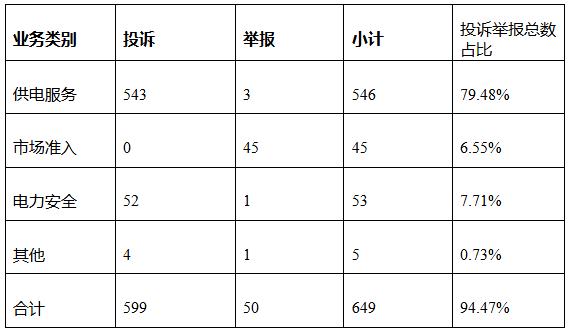 電力行業(yè)排在首位,數(shù)量為649件、占投訴舉報總數(shù)的94.47%,主要集中在供電服務(wù)、市場準(zhǔn)入、電力安全等方面。