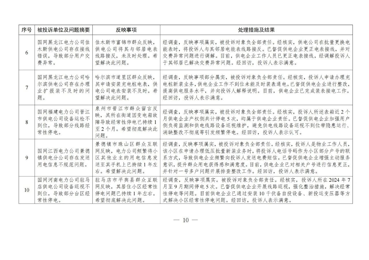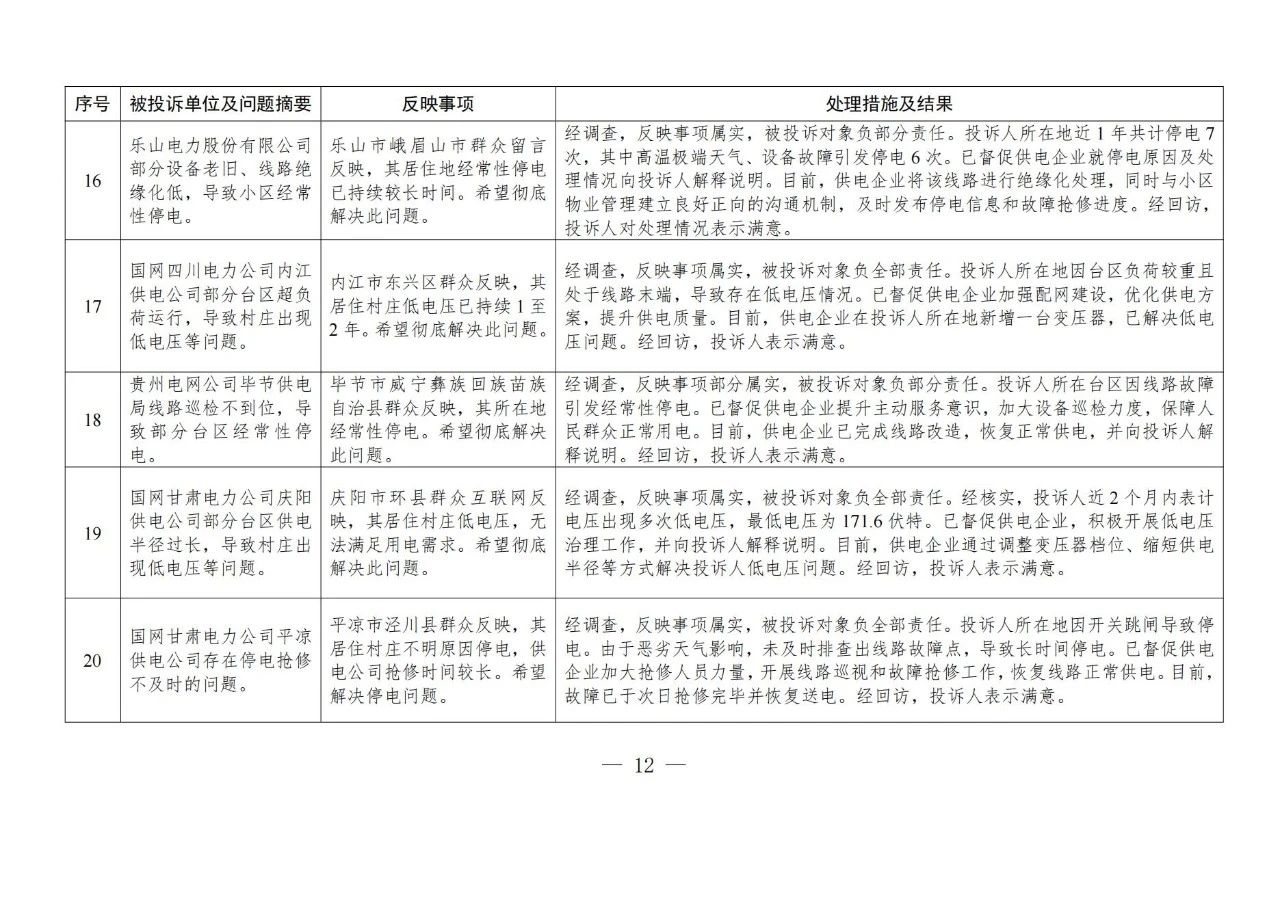 針對群眾反映的投訴舉報,國家能源局派出機構(gòu)嚴格按照有關(guān)法規(guī)政策規(guī)定進行處理。一是督促供電企業(yè)進一步規(guī)范用電報裝管理,強化業(yè)擴報裝全流程管控,嚴格按照規(guī)定時限完成裝表接電;二是要求供電企業(yè)加強設備隱患排查整治,強化停電搶修管理,合理規(guī)劃計劃停電,增加搶修資源投入,提升設備管控和停電搶修能力,切實提高供電可靠性;三是通過行政處罰、監(jiān)管約談、責令整改等方式,糾正有關(guān)企業(yè)違法違規(guī)行為,維護公平公正的市場秩序和群眾合法權(quán)益;四是通過解釋說明、澄清事實,消除群眾誤解。(2024年11月12398熱線典型投訴舉報事項具體處理情況見附件2)