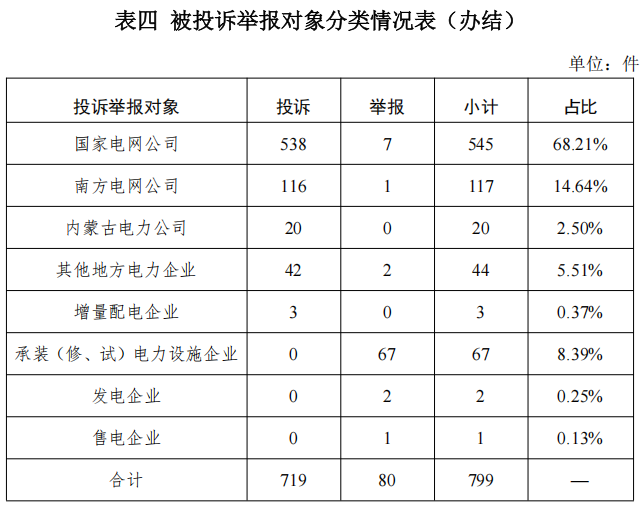 從被投訴舉報對象看,供電企業(yè)719件、占投訴舉報總數(shù)的89.99%,其中國家電網(wǎng)公司545件、占比68.21%,南方電網(wǎng)公司117件、占比14.64%,內(nèi)蒙古電力公司20件、占比2.50%,其他地方電力企業(yè)44件、占比5.51%,增量配電企業(yè)3件、占比0.37%;承裝(修、試)電力設施企業(yè)67件、占比8.39%;發(fā)電企業(yè)2件、占比0.25%;電力交易機構(gòu)1件、占比0.13%。