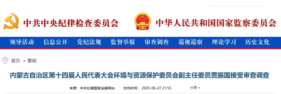 中央紀(jì)委國(guó)家監(jiān)委網(wǎng)站6月27日消息,據(jù)內(nèi)蒙古自治區(qū)紀(jì)委監(jiān)委消息:內(nèi)蒙古自治區(qū)第十四屆人民代表大會(huì)環(huán)境與資源保護(hù)委員會(huì)副主任委員賈振國(guó)涉嫌嚴(yán)重違紀(jì)違法,目前正接受內(nèi)蒙古自治區(qū)紀(jì)委監(jiān)委紀(jì)律審查和監(jiān)察調(diào)查。