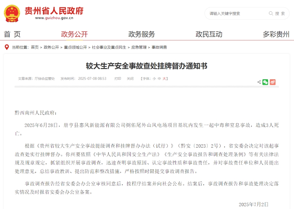 2025年6月28日,冊亨縣惠風(fēng)新能源有限公司弼佑尾外山風(fēng)電場項目基坑內(nèi)發(fā)生一起中毒和窒息事故,造成3人死亡。