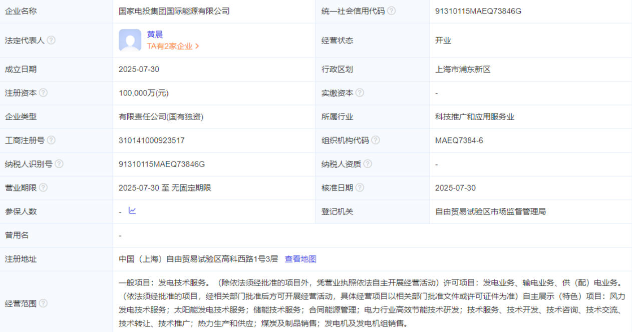 7月30日,國(guó)家電投集團(tuán)國(guó)際能源有限公司成立,法定代表人為黃晨,注冊(cè)資本100000萬(wàn)人民幣,由國(guó)家電力投資集團(tuán)有限公司全資持股。
