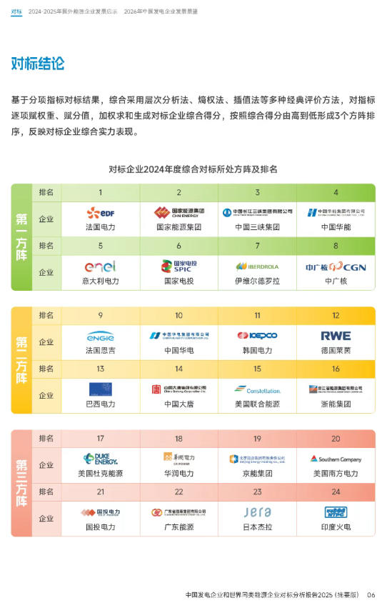誰在領(lǐng)跑?2024年全球發(fā)電企業(yè)競爭格局呈現(xiàn)“穩(wěn)中有變、動態(tài)調(diào)整”的特點。從綜合排名看,法國電力、國家能源集團、中國三峽集團、中國華能、意大利電力、國家電投、伊維爾德羅拉、中廣核8家企業(yè)處于第一方陣。綜合排名最明顯的變化,為法國電力與國家能源集團的“首位輪換”,從去年的第二位躍居榜首。法國電力全年營業(yè)收入1243億美元,同比下降15.0%,營收明顯下降未對公司盈利能力產(chǎn)生實質(zhì)性影響。國家能源集團綜合排名第二,相較2023年下降一個名次。截至2024年底,國家能源集團發(fā)電裝機容量達到3.55億千瓦,繼續(xù)保持全部對標企業(yè)中企業(yè)頭名地位。受國內(nèi)煤炭價格下行影響,國家能源集團營業(yè)收入同比下降2.3%。2024年,中國華能綜合排名第四,同比上升一個名次。中國華能專利實力排名位居國內(nèi)對標企業(yè)首位,發(fā)電裝機容量、發(fā)電量排名與2023年持平,位居第二位。美國聯(lián)合能源2024年對標綜合排名從第23位躍升至第15位,上升8名。美國聯(lián)合能源凈資產(chǎn)收益率更是高達30.1%,位列第一,比2023年提高16個百分點。排名變化背后,既是企業(yè)戰(zhàn)略與市場環(huán)境的直接反映,也預(yù)示著能源企業(yè)從規(guī)模擴張向質(zhì)量效益轉(zhuǎn)型的必然趨勢。