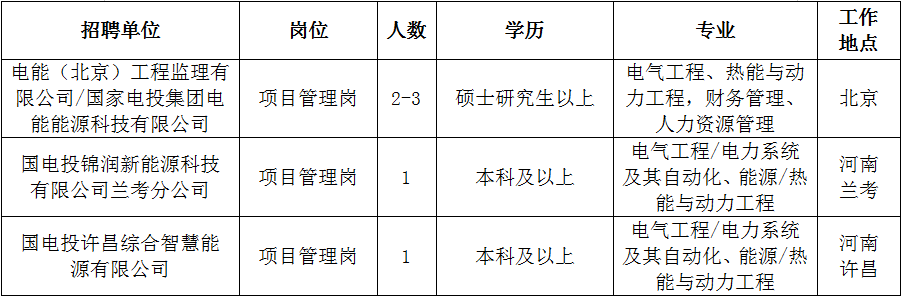 根據(jù)業(yè)務(wù)發(fā)展需要,中國(guó)電能所屬企業(yè)電能(北京)工程監(jiān)理有限公司、國(guó)家電投集團(tuán)電能能源科技有限公司、國(guó)電投錦潤(rùn)新能源科技有限公司蘭考分公司、國(guó)電投許昌綜合智慧能源有限公司面向2023年高校應(yīng)屆畢業(yè)生進(jìn)行公開(kāi)選聘。