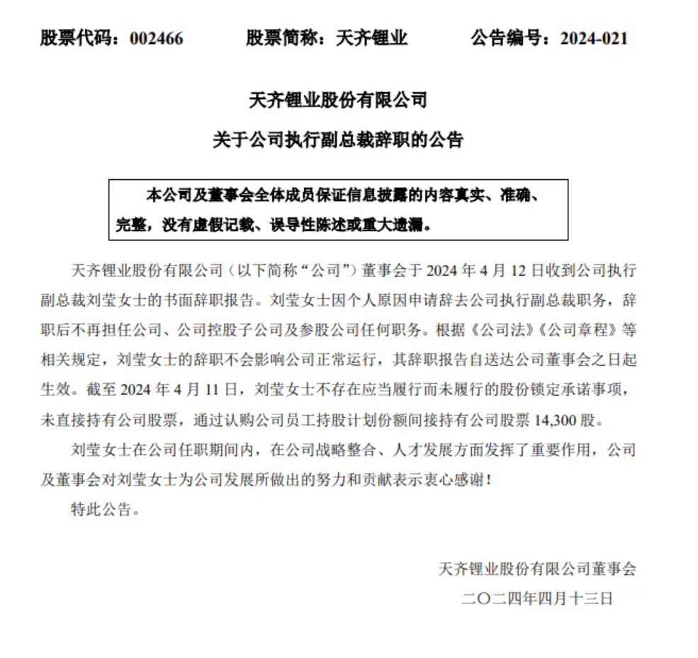 天齊鋰業(yè)發(fā)布公告稱,公司董事會于4月12日收到公司執(zhí)行副總裁劉瑩女士的書面辭職報告。劉瑩女士因個人原因申請辭去公司執(zhí)行副總裁職務(wù) ,辭職后不再擔(dān)任公司、公司控股子公司及參股公司任何職務(wù)。根據(jù)《公司法》《公司章程》等相關(guān)規(guī)定,劉瑩女士的辭職不會影響公司正常運行,其辭職報告自送達(dá)公司董事會之日起生效。