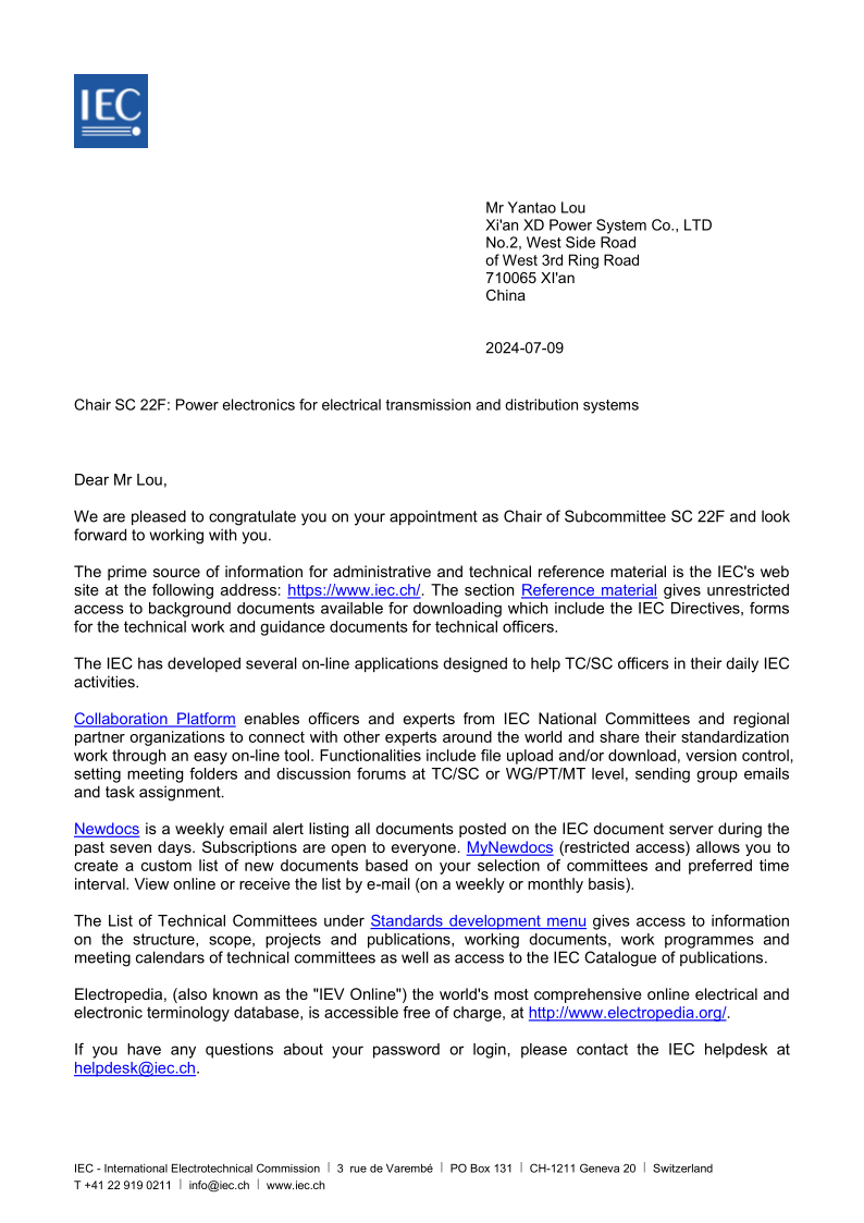 中國電氣裝備代表當選國際電工委員會(IEC )TC22 SC22F主席