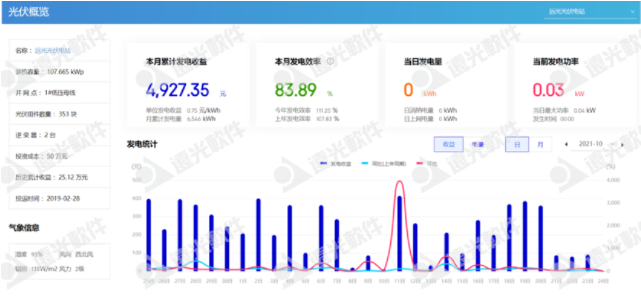 遠光軟件園的屋頂分布式光伏發(fā)電站,可利用面積1238平方米,總裝機容量為107.665kWp,選用 305Wp 單晶硅組件共353塊,采用組串式逆變器2臺。系統(tǒng)年均發(fā)電量為105845kWh,可減少二氧化碳排放105.53噸。