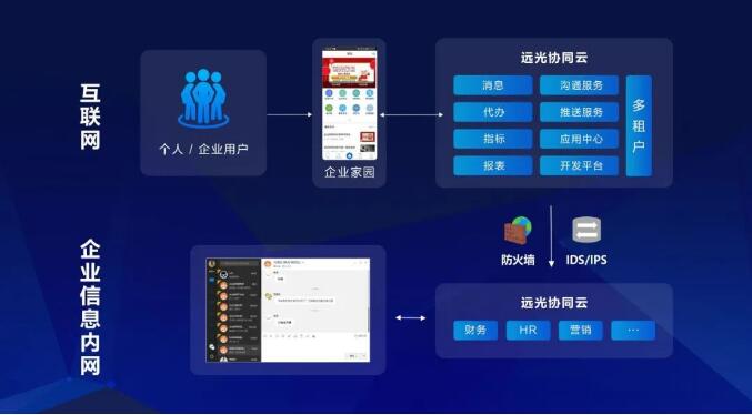 遠(yuǎn)光“企業(yè)家園”采用公有云與私有云共存的混合云架構(gòu),即對(duì)于企業(yè)商密等級(jí)較低的數(shù)據(jù),如消息提醒、待辦提醒等可以通過移動(dòng)端在外網(wǎng)進(jìn)行實(shí)時(shí)訪問,對(duì)于企業(yè)內(nèi)部數(shù)據(jù)、商密等級(jí)高的數(shù)據(jù),依然保留在本地,通過企業(yè)電腦端才能訪問。充分利用互聯(lián)網(wǎng)應(yīng)用的靈活性、便利性的同時(shí),保證數(shù)據(jù)的安全性、私密性。