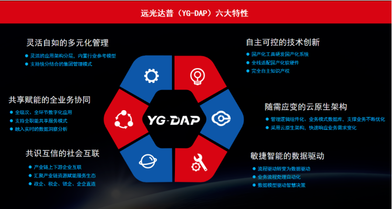 遠(yuǎn)光DAP是遠(yuǎn)光軟件以“助力企業(yè)數(shù)字化轉(zhuǎn)型升級(jí)”為目標(biāo)研發(fā)推出的新一代企業(yè)數(shù)字核心應(yīng)用系統(tǒng),采用“云原生”技術(shù),按照“全棧國(guó)產(chǎn)化、組件式接入、全業(yè)務(wù)協(xié)同、嵌入型分析、服務(wù)化運(yùn)營(yíng)”的設(shè)計(jì)理念,建設(shè)“戰(zhàn)略規(guī)劃、資源管理、生產(chǎn)經(jīng)營(yíng)、共享服務(wù)、數(shù)據(jù)運(yùn)營(yíng)”五大核心應(yīng)用,以數(shù)據(jù)驅(qū)動(dòng)業(yè)務(wù)管理,以智能支撐戰(zhàn)略決策,促進(jìn)產(chǎn)業(yè)互聯(lián)、社會(huì)互聯(lián)生態(tài)構(gòu)建。