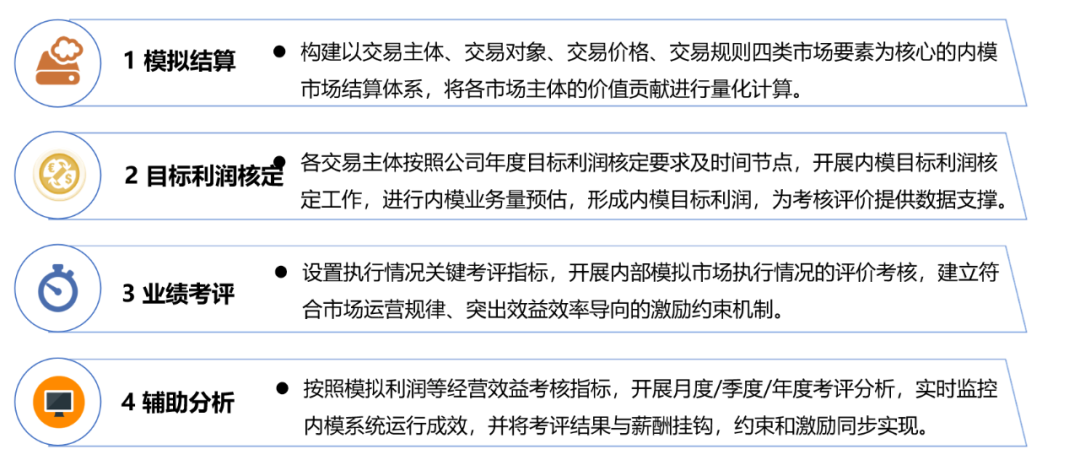 內(nèi)部模擬市場(簡稱“內(nèi)模市場”)是將企業(yè)內(nèi)部各單位視同獨(dú)立市場主體進(jìn)行管理,引入市場交易機(jī)制,將以往內(nèi)部單位之間無償提供的支撐服務(wù)按照市場化模擬結(jié)算,在內(nèi)部各單位之間形成完整的收入、支出循環(huán),從而計(jì)算出各單位的模擬收入和模擬成本。內(nèi)模市場以“模擬利潤”為核心,完整量化反映各單位的真實(shí)經(jīng)營成果和價(jià)值貢獻(xiàn),使企業(yè)管理者了解各單位的真實(shí)經(jīng)營水平和盈利能力,同時(shí)激活企業(yè)內(nèi)部各單位各部門各員工提質(zhì)增效的動力,從而將外部市場壓力在企業(yè)內(nèi)部層層傳導(dǎo),打造創(chuàng)新管理機(jī)制,煥發(fā)企業(yè)發(fā)展活力。