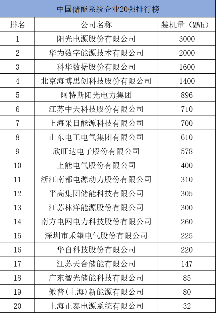 陽光電源股份有限公司以銷量3000MWh的成績依舊穩(wěn)居第一,華為數(shù)字能源技術(shù)有限公司和科華數(shù)據(jù)股份有限公司位居第二和第三。