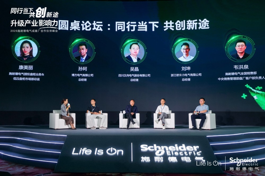 峰會(huì)現(xiàn)場(chǎng),在以“同行當(dāng)下,共創(chuàng)新途”為主題的圓桌論壇中,博方電氣有限公司總經(jīng)理孫珂、四川漢舟電氣股份有限公司總經(jīng)理吳晶、浙江歐日力電氣有公司總經(jīng)理劉坤、施耐德電氣授權(quán)盤柜業(yè)務(wù)&低壓盤柜市場(chǎng)部總監(jiān)康美麗、施耐德電氣全國銷售部中央銷售管理部盤廠客戶部負(fù)責(zé)人韋洪泉齊聚一堂,共同探討行業(yè)發(fā)展新趨勢(shì),詳細(xì)分享與施耐德電氣聯(lián)合創(chuàng)新合作經(jīng)驗(yàn),為行業(yè)轉(zhuǎn)型提供可復(fù)制、可落地的實(shí)踐案例,合力打造更具韌性與創(chuàng)新活力的協(xié)作生態(tài)。